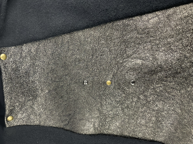 La feutrine noire apporte douceur et tenue ; le cuir doré en chèvre accroche la lumière.