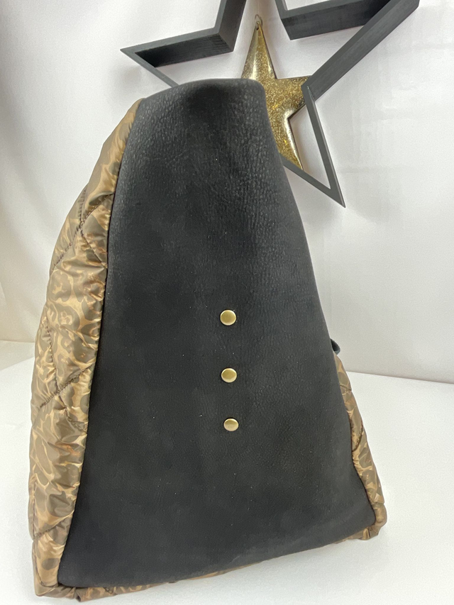 Le matelassé léopard donne le caractère, le cuir noir structure l’allure.