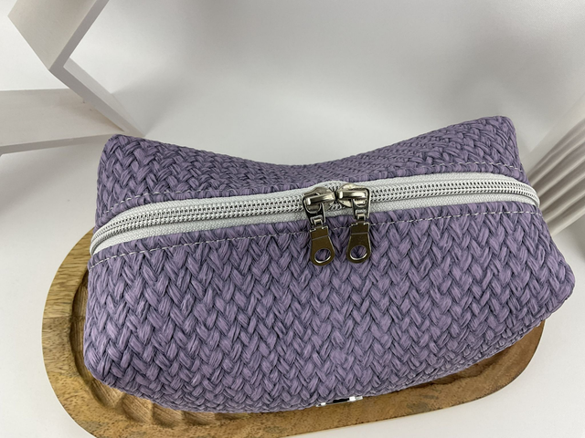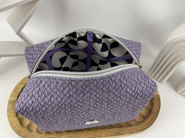• Cousue main en micro-série, elle associe un simili-cuir en relief à un Burlington imprimé violet, pour une touche graphique et élégante.