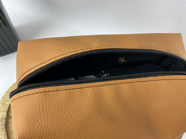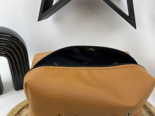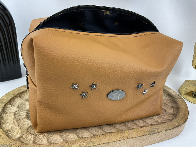 Cousue main en micro-série, elle associe un simili-cuir lisse camel à un Burlington imprimé léopard & étoiles dorées, pour une touche chaude et élégante.